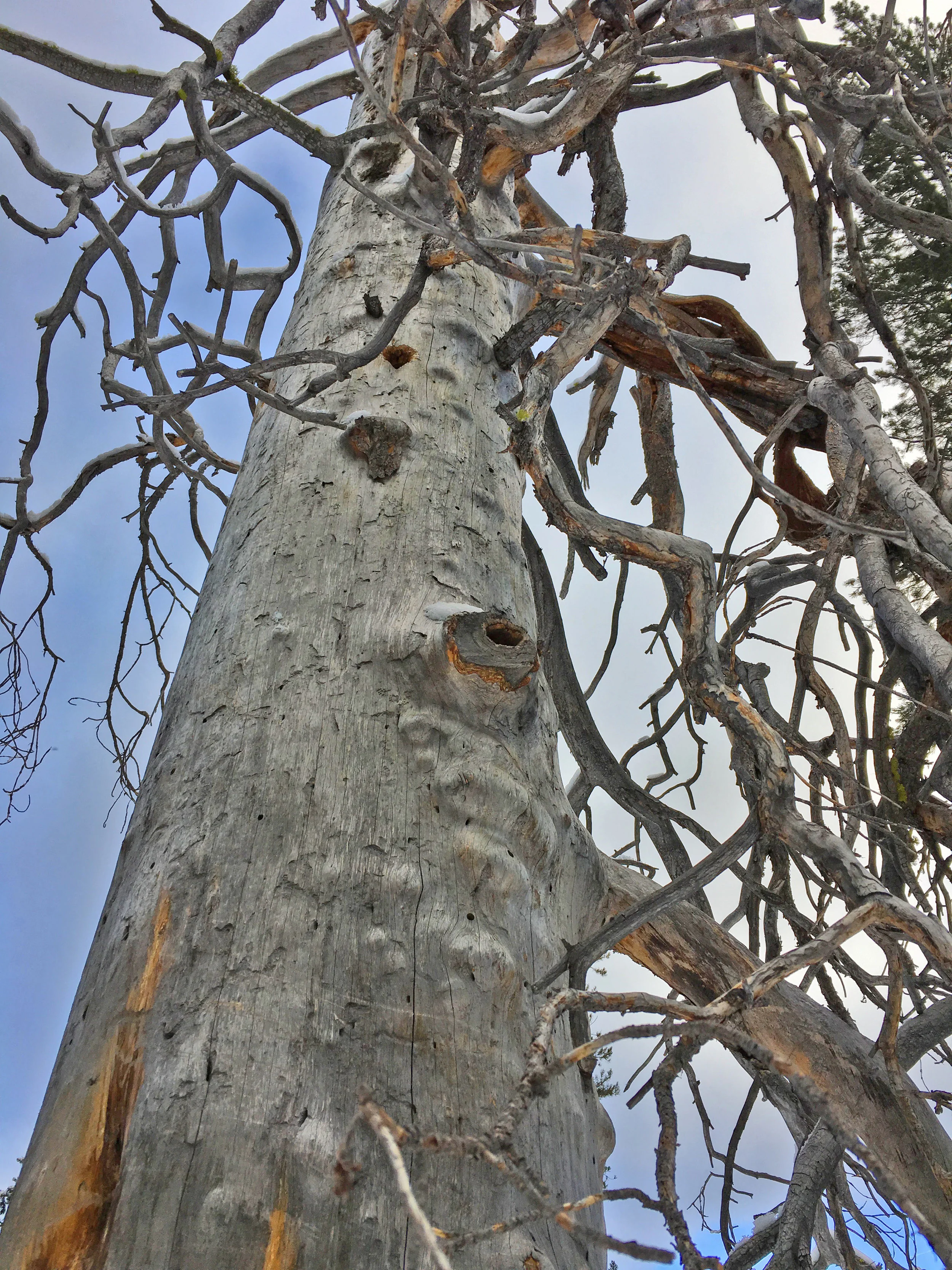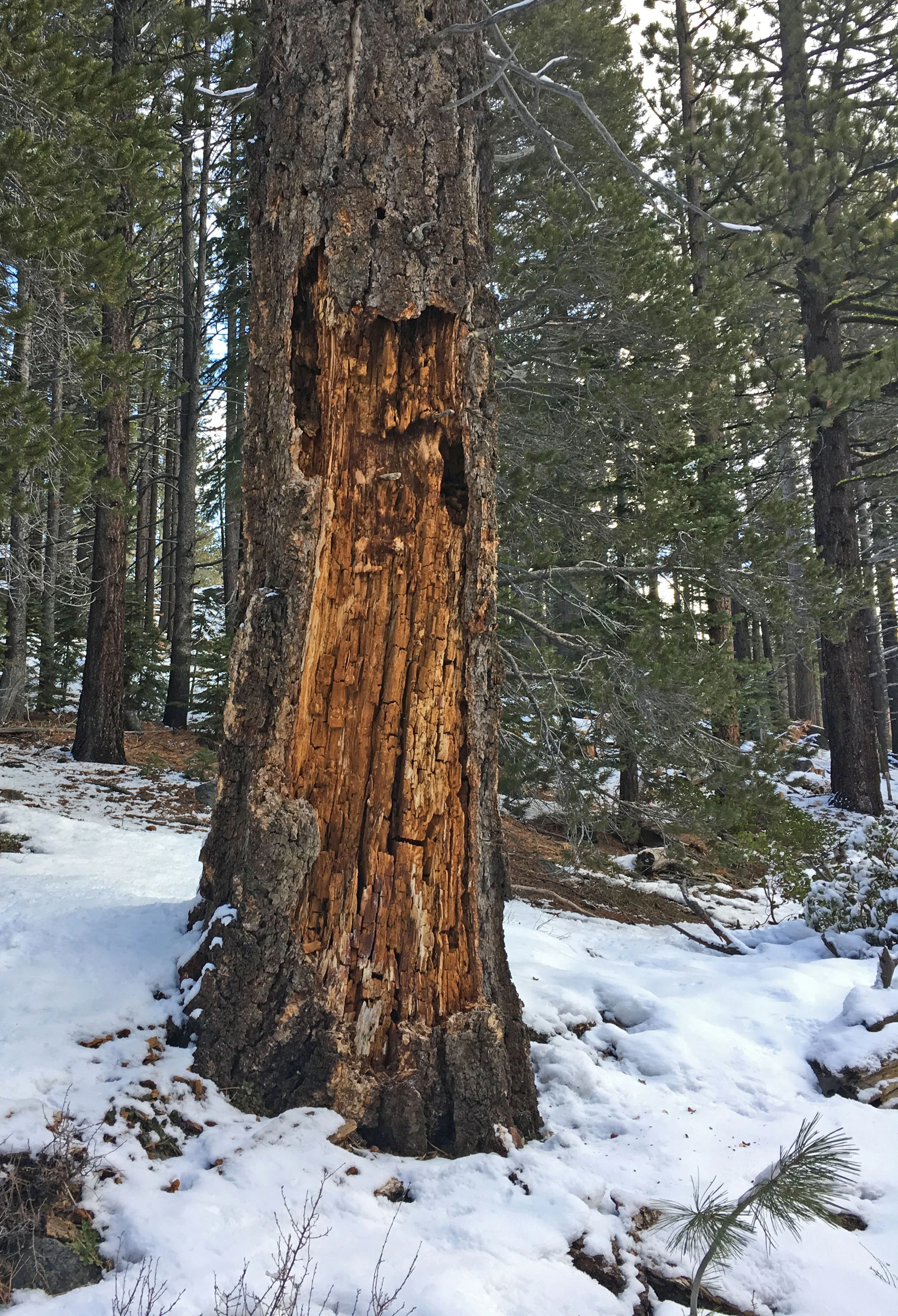 There are some amazing snags here, as well as living trees suffering from something, beetle infestation? Enormous piles of trees stacked I’m told by a giant tree combine that can cut down and de-branch a 40 foot tree every 60 seconds. The Sierras are in the grips of a cycle of infestations due to drought and warmer winters. This leads directly to increased risk of forest fire. As the trees go, we go. The Forest Service here is hoping to thin the forest to provide more open spaces and meadows to act as buffers against a runaway fire.