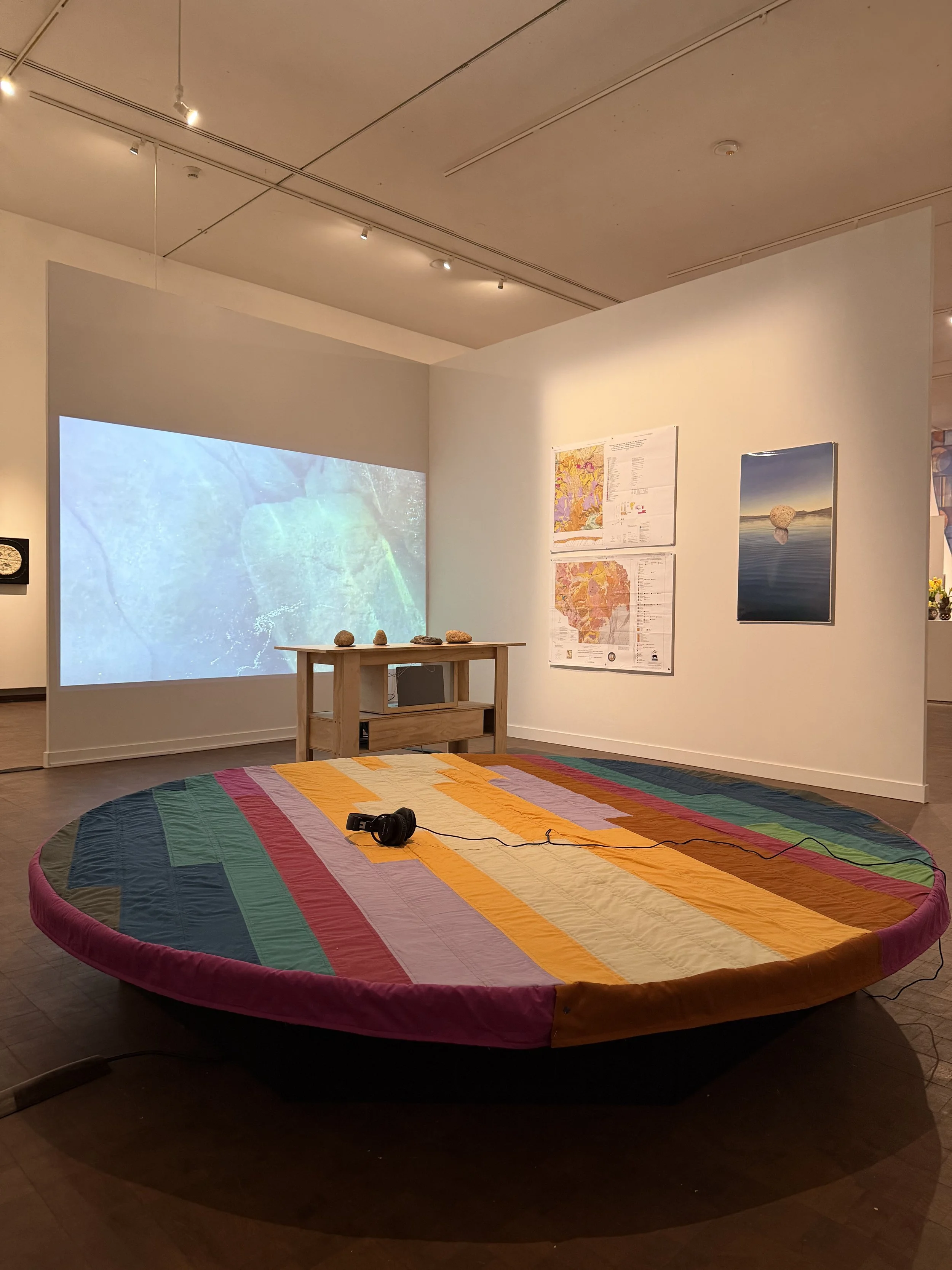 I’m back in Bellingham, WA after 10 months off for professional leave, or sabbatical. It’s beautiful here. Each morning I drive past Lake Samish and it’s so glassy it looks like a dream. Can’t wait for things to calm down so I can get out on the water. Rebuilding Lactustrine Dreams became a lesson in persistence. First I left the projector’s remote in California, then the quilt was too big, then it was too small so I had to recut the platform, finally my tube amp blew up the day before the opening! But I rebuilt the vibroacoutic bed, finally finished the quilt and it’s better than ever. I still have some more ideas for the soundscape and plan to make some mods this weekend before the reception on April 16th!